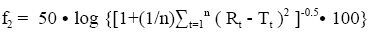 其中n為取樣時間點個數(shù),Rt為參比樣品(或變更前樣品)在t時刻的溶出度值,Tt為試驗批次(變更后樣品)在t時刻的溶出度值。相似因子(f2)是衡量兩條溶出曲線相似度的參數(shù),計算公式如下: