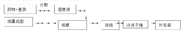 冷凍干燥時(shí)將需要干燥的藥物預(yù)先凍結(jié)成固體,然后低溫條件下,從凍結(jié)狀態(tài)不經(jīng)液體直接升華除去水分的一種干燥方法。其主要制備工藝:將不溶性藥物(<400mg)或水溶性藥物(<60mg)同水溶性基質(zhì)包括多糖,明膠,多肽等及其他一些輔料如混懸劑,潤濕劑,著色劑等的混懸液定量分裝于一定模具中,冷凍成固態(tài),在減壓升溫,通過升華作用除去水分,得高孔隙率的固體制劑,如下圖所示: