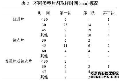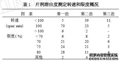 2. 2 藥物片劑或膠囊劑經(jīng)口服后須經(jīng)過崩解、溶解過程才能被機(jī)體吸收利用,溶出度測(cè)定較崩解時(shí)限檢查向吸收過程前進(jìn)了一步,但仍然需要經(jīng)過崩解過程。片劑根據(jù)其性狀的不同崩解時(shí)限規(guī)定有所區(qū)別,通常情況下普通片、薄膜衣片和糖衣片分別要求在15 ,30 和60 min 內(nèi)全部崩解。從表2中可以看出在溶出度檢查取樣時(shí)間的選擇上片劑性狀的差異沒有得到充分體現(xiàn),普通片45 min 及其以上時(shí)間取樣的約占45 % ,在普通片和包衣片并存時(shí),只有鹽酸四環(huán)素片規(guī)定僅糖衣片檢查溶出度和鹽酸肼屈嗪片規(guī)定普通片30 分鐘、糖衣片60 min 取樣外,其余的都沒有加以區(qū)分。藥典規(guī)定檢查溶出度的制劑不再進(jìn)行崩解時(shí)限的檢查,在藥物的質(zhì)量控制中兩者之間存在一定的聯(lián)系,雖然溶出度測(cè)定在一定程度上取決于藥物的溶解性能,但如何體現(xiàn)劑型的特點(diǎn)也應(yīng)有所考慮。另外,鹽酸地爾硫芏卓片、格列齊特片和頭孢呋辛酯片及其膠囊采用了兩點(diǎn)取樣,規(guī)定了各自的限度要求,使溶出的速度和程度得到了充分體現(xiàn),其方法值得借鑒。